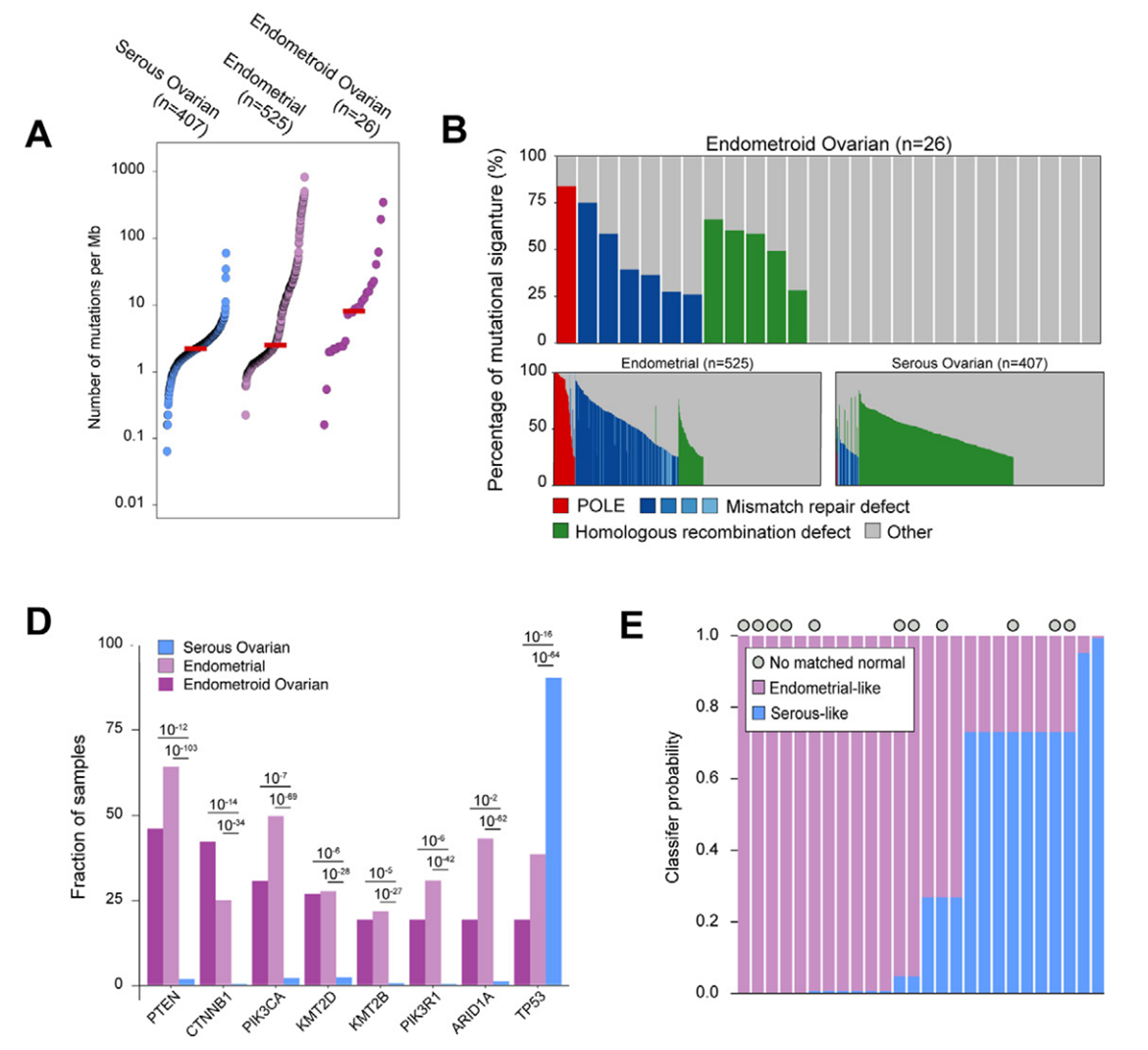 Due to the similarities in histopathological and molecular features between ovarian endometrioid cancer and endometrial endometrioid cancer, the EC classification scheme can be extended to the latter. A study demonstrated that the proportions of each TCGA molecular subtype in ovarian endometrioid cancer and endometrial endometrioid cancer were as follows: the proportions of the POLE mutant were 5% and 7.6%, respectively (P = 0.594); the percentages of defect types with mismatch repair were 14.6% and 29.2% (P < 0.001), respectively; the percentages of abnormal p53 were 14% and 7.8% (P = 0.097), respectively; and the percentages of nonspecific molecular patterns were 66.4% and 55.4%, respectively (P = 0.002). Progression-free survival analyses are presented in the following table.