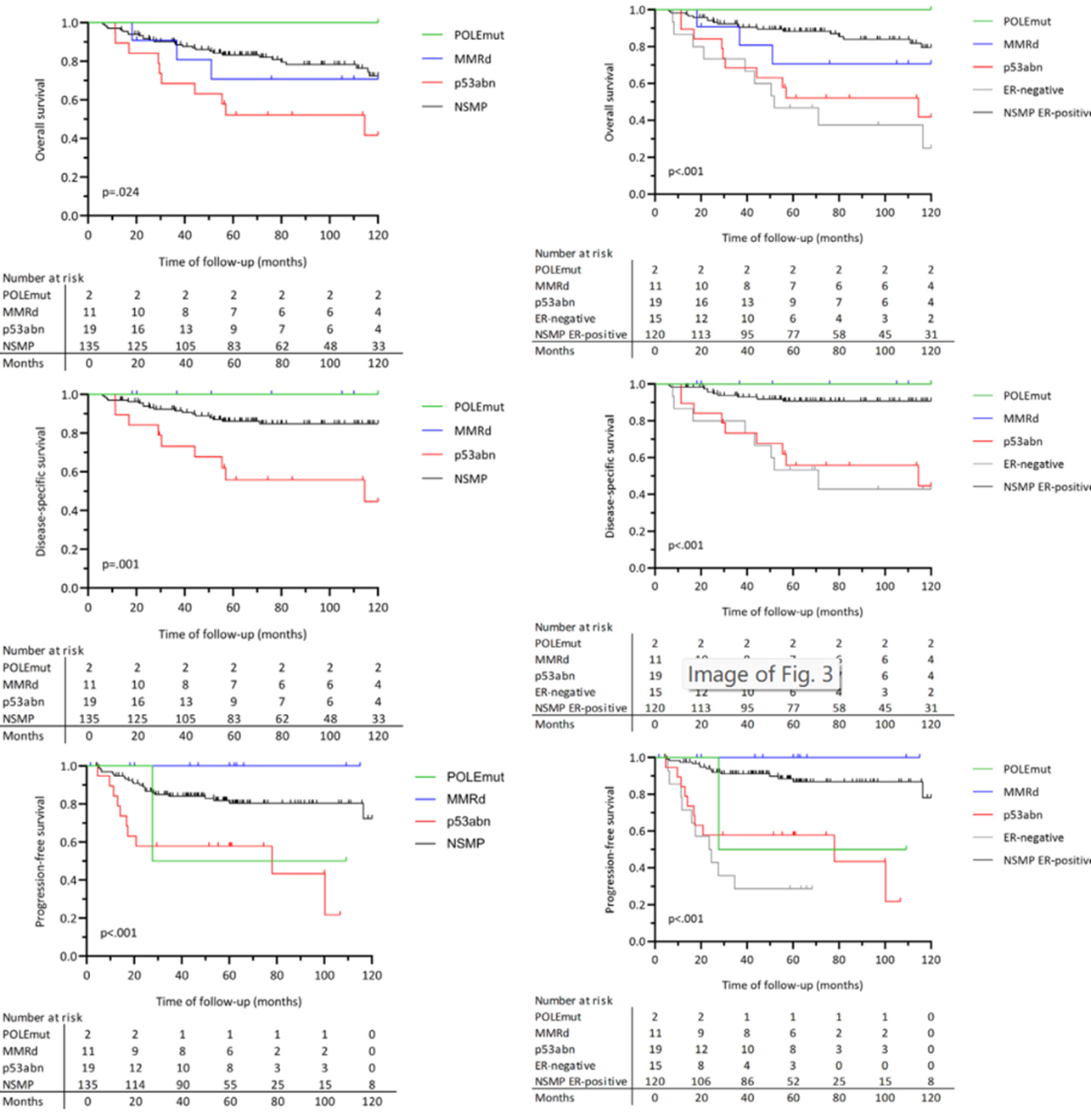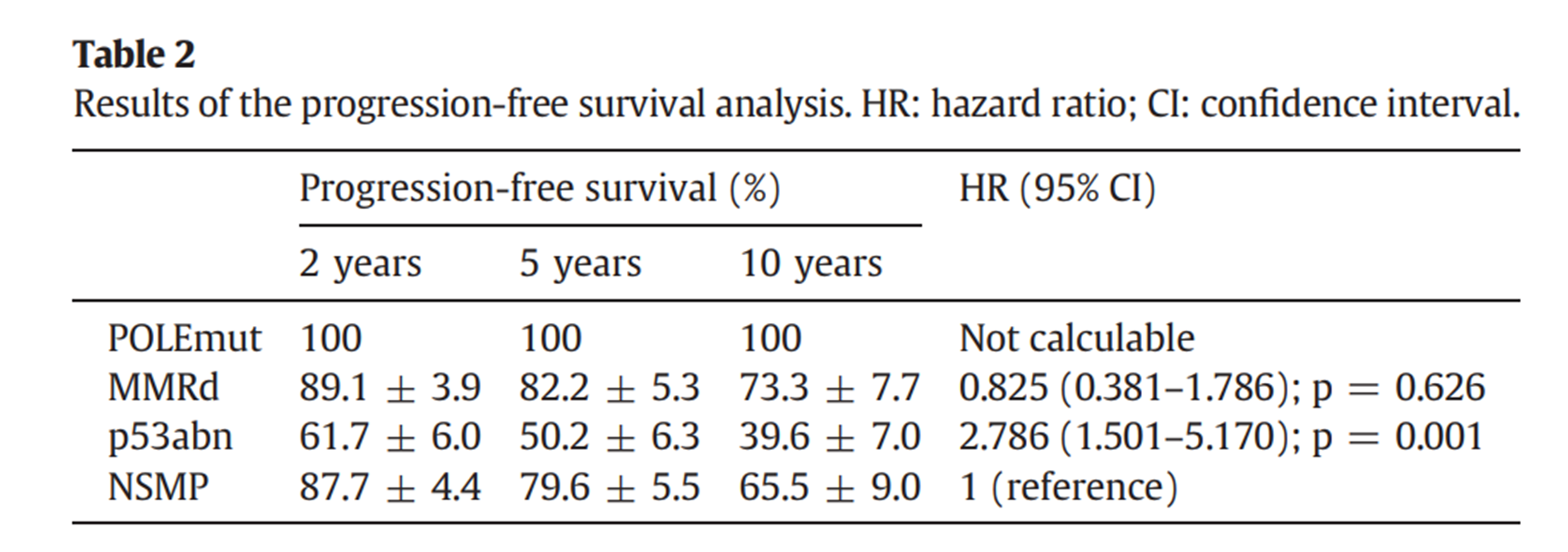 Another multicenter retrospective cohort study, conducted across multiple hospitals with a relatively large cohort size and an extended follow-up period, was performed. Additionally, a gynecologic pathologist independently reviewed the histology and immunohistochemical staining results, and a joint review of the divergent cases was conducted. As a result, out of the 167 patients enrolled, 1.2% had POLEmut type tumors, 6.6% had MMRd type tumors, 11.4% had p53abn type tumors, and 80.8% had NSMP type tumors. No ER-negative tumors were identified in the POLEmut and MMRd subtypes, and ER status lacked prognostic value in the p53abn subtypes. Within the NSMP subtypes, 11.1% of the tumors were ER-negative, and the 10-year overall survival rate was lower (HR=3.92, 95% CI=1.67-9.21, p=0.002)[6].